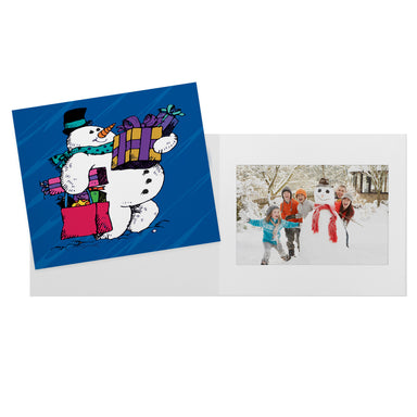 Also known as the Snowman Photo Folder This holiday photo folder features a blue background with a snowman holding presents on the front Insert s...