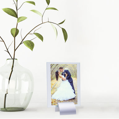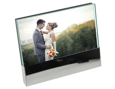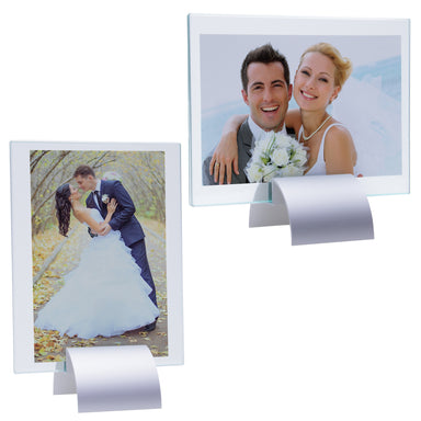 Insert size: 4" x 6"Glass Picture Frame with Metal StandItem number: 606550 Insert size: 4" x 6" Beautiful simple and modern glass picture frame wi...