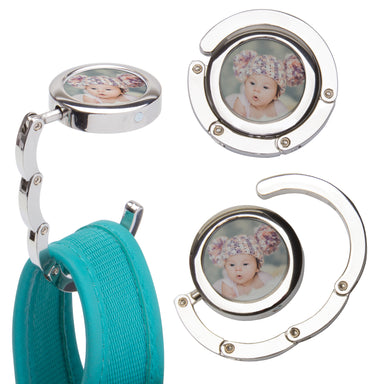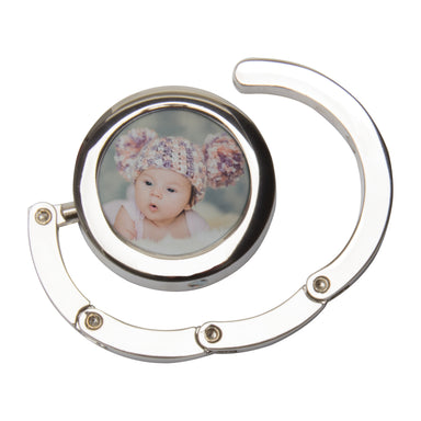 Silver Photo Purse Hook Item number: 7623 Part of the Photo Lux Line Insert size: 1" diameter To insert your photo: Remove white sticky paper fro...