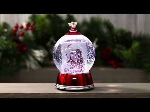 - Design features a clear globe with a Santa figurine on top, and a red base with silver trim