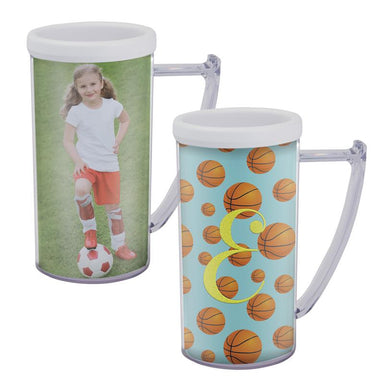 Insert size: 9.375" x 4" OR one 6" x 4" photo and one 3-3/8" x 4" photo 16 oz. capacity Can hold hot or cold beverages To insert your own design ...