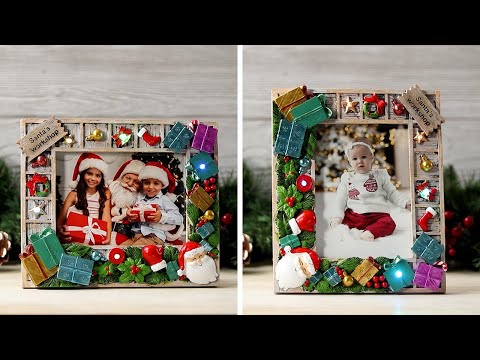 - Frame is shaped like a rectangle, and features green garland, mistletoe, wrapped presents, ornaments, and Santa along the bottom and left side