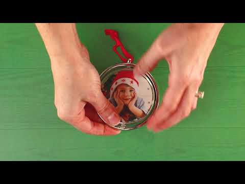 • Para insertar sus fotos o diseños, tire suavemente del borde plateado y coloque la parte central de plástico, abra las dos piezas de plástico transparente y coloque las imágenes dentro, luego vuelva a juntar las dos mitades de plástico y empújelas hacia el anillo plateado, bloqueando el medio. sección en su lugar, ¡su adorno ahora está listo para colgar en su árbol de Navidad!