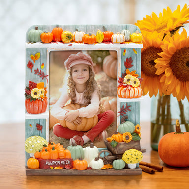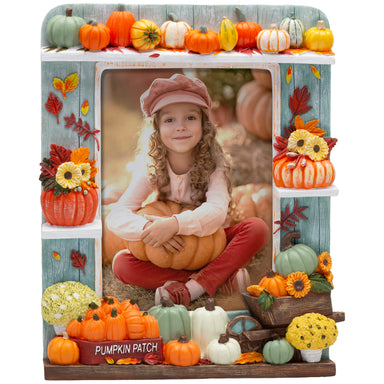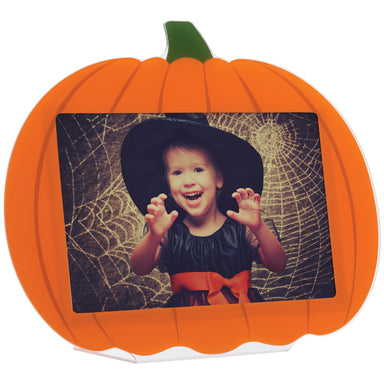 Tamaño de inserción: 6" x 4" Tamaño total: 8.125" x 6.625 Hecho de poliestireno Caballete doblado hacia atrás El marco de la calabaza pr...